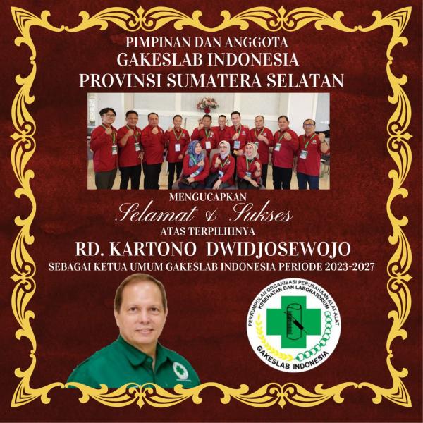 Musionline.co.id, Palembang -- Pengurus Perkumpulan Organisasi Perusahaan Alat-Alat Kesehatan dan Laboratorium (Gakeslab) Sumsel mengucapkan selamat atas terpilihnya Bapak Rd Kartono Dwidjosewojo sebagai Ketua Umum GAKESLAB Indonesia periode 2023-2027 pada Munas VIII GAKESLAB Indonesia yang diselenggarakan di Kota Yogyakarta pada tanggal 9-10 Agustus 2023.
