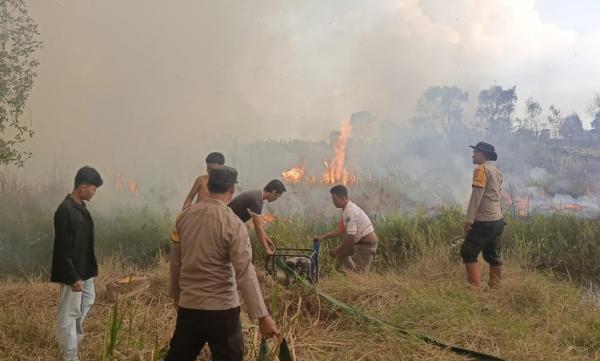 Kebakaran Hutan dan Lahan Semi Gambut di Desa Kelampaian, Polsek Rantau Alai Bergerak Cepat Padamkan Api.