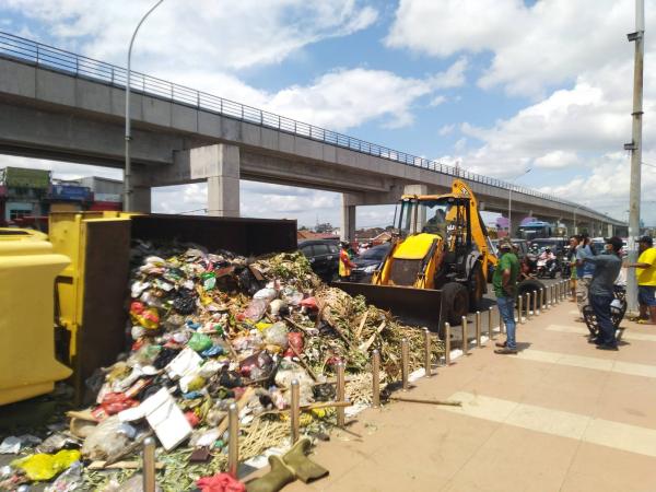 Musionline.co.id, Palembang - Tumpukan sampah lantaran mobil truk pengangkut sampah terbalik di atas jembatan Ampera, bikin macet arus lalu lintas yang melintasi jembatan tersebut, Jumat (13/8/2021) 13.15 WIB.